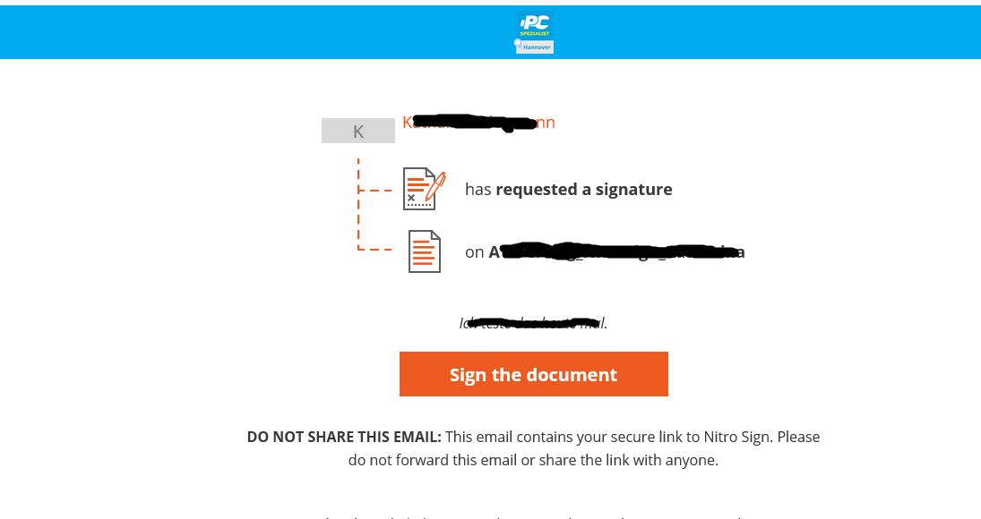 Sie erhalten eine E-Mail von Nitro Sign mit der Anfrage, das von uns erstellte Dokument zu unterzeichnen.