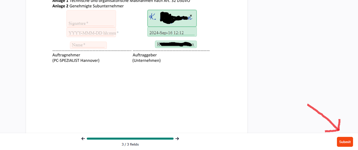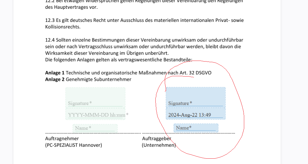 Klicken Sie bitte an der entsprechenden Stelle im Dokument in das blass schraffierte Feld mit "Signature" für den Auftraggeber und generieren Sie eine Unterschrift. Sie können hier zwischen verschiedenen Arten wählen. Geben Sie bitte außerdem Ihren Klarnamen im Feld "Name" direkt darunter ein.