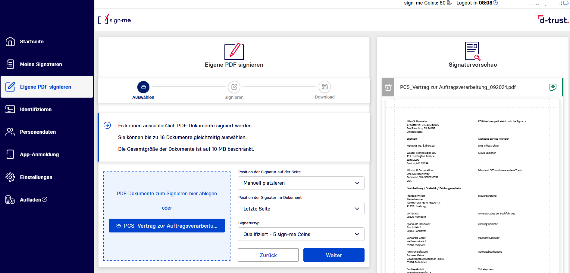 - Nach der erfolgreichen Verifizierung können Sie über Eigene PDF signieren ein PDF-Dokument hochladen und digital unterschreiben.