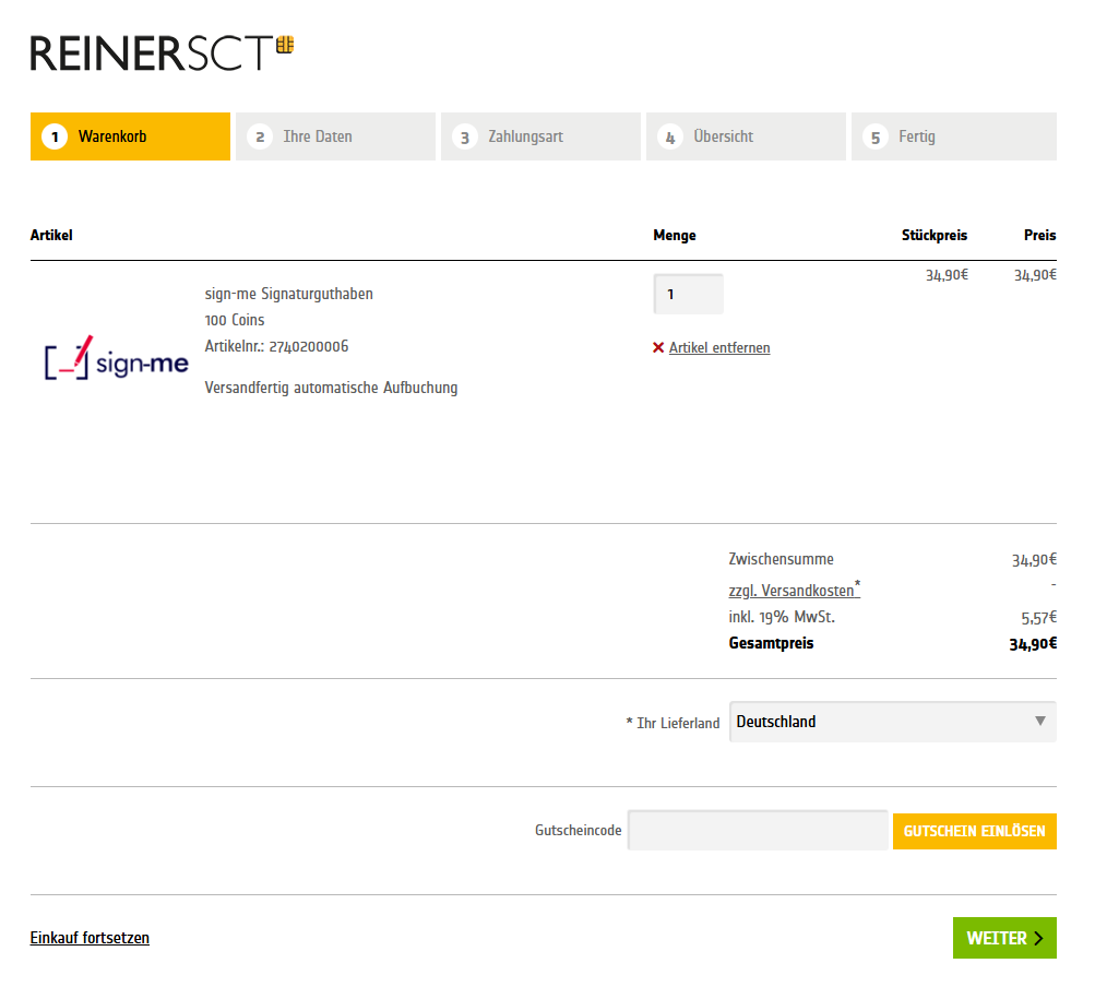 - 100 sign-me Coins für 29,33€ netto (34,90€ brutto)