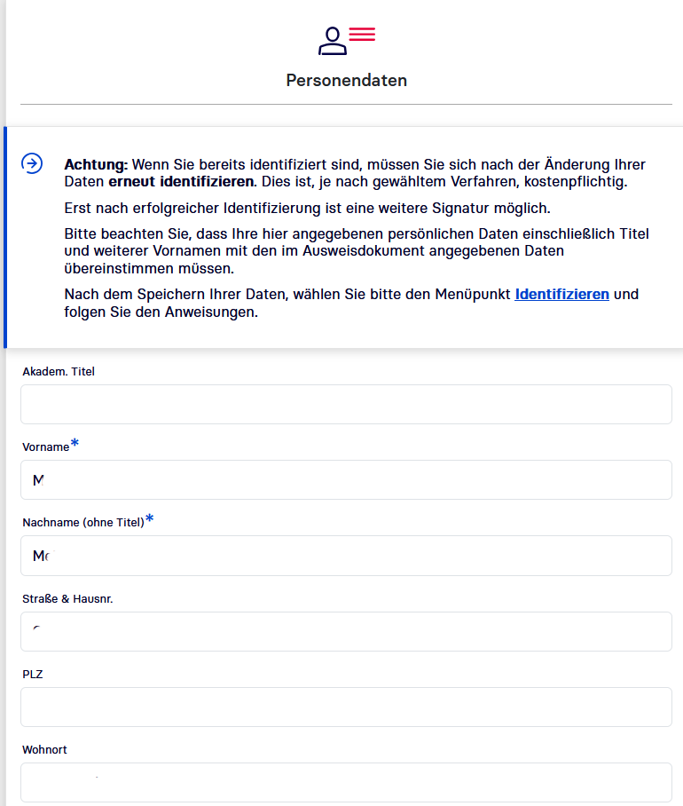 - Achten Sie darauf, dass Ihre Personendaten vollständig sind, bevor Sie mit der Identifzierung starten. Jede Anpassung erfordert eine erneute Identifizierung.