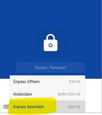 - Enpass schließen: Strg + Q oder auf Enpass beenden klicken