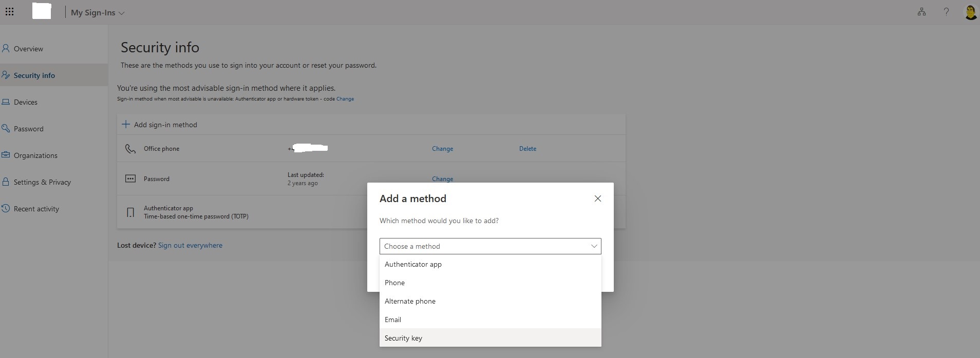 - Check whether the methods are up-to-date and whether there are at least two different ways. For example, the Microsoft Authenticator, password manager Enpass, security key (e.g. YubiKey or Nitrokey), office phone and the mobile phone number.