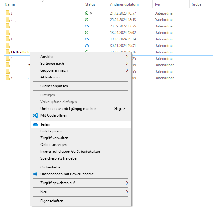 • Klicken Sie mit der rechten Maustaste auf den Ordner oder die Datei und wählen Sie die Option ☁ Teilen aus