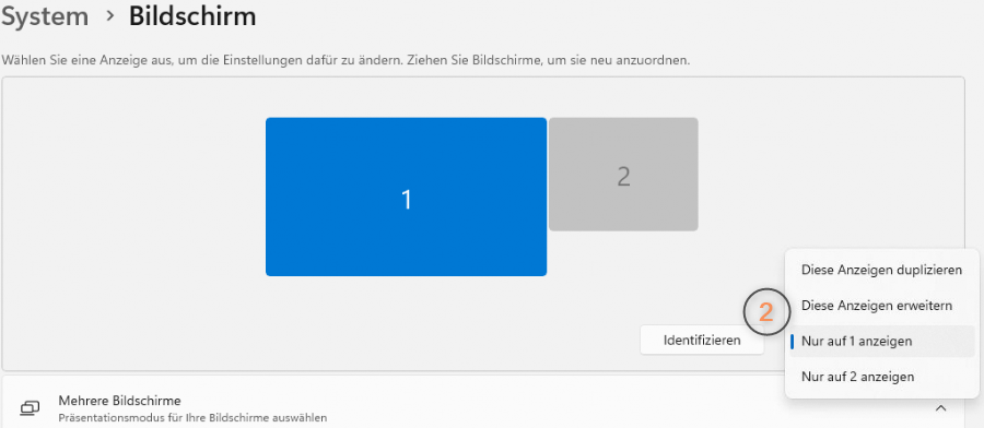 Hier (2) wählen Sie, wie sich Ihre Bildschirme verhalten sollen