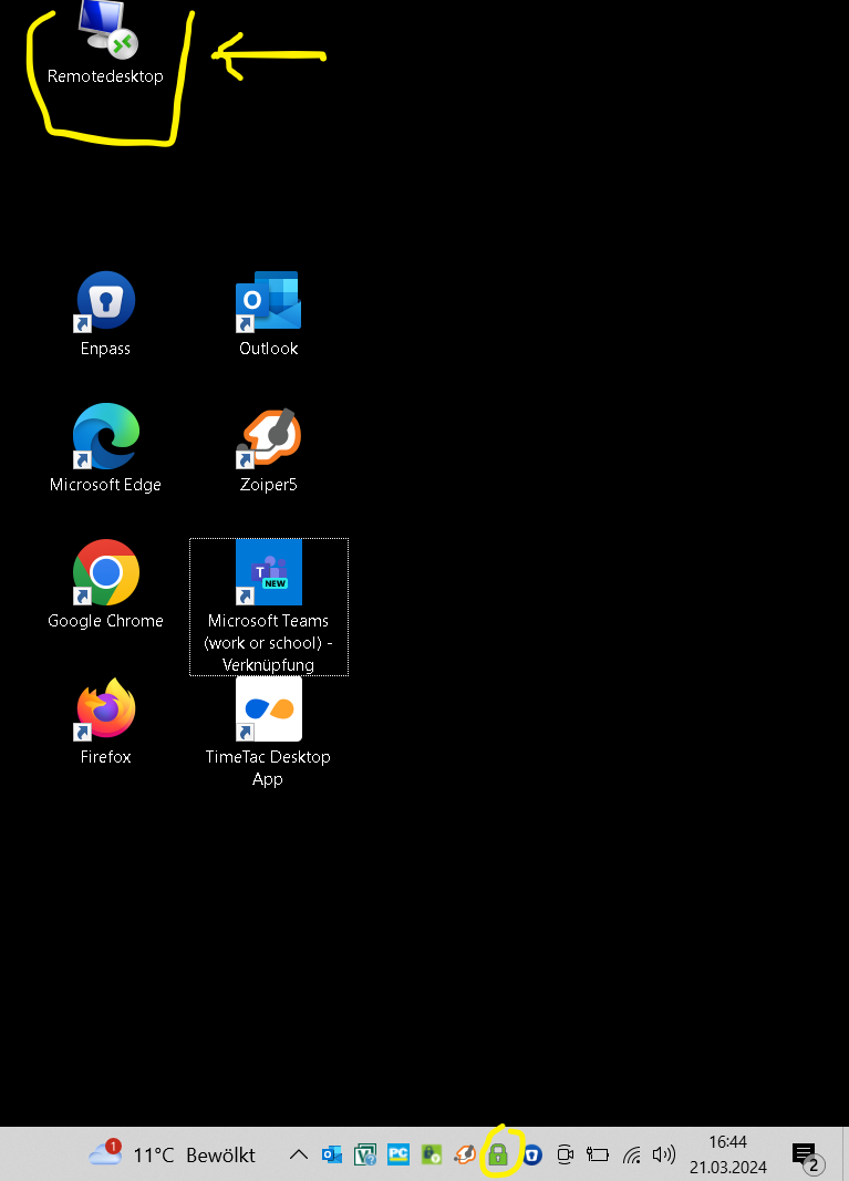 - Verbinden Sie sich nun mit dem Remotedesktop. Das Symbol ist ein Monitor mit zwei grünen Pfeilen. Dort ist in der Regel der Name oder die IP-Adresse des Rechners bereits hinterlegt.