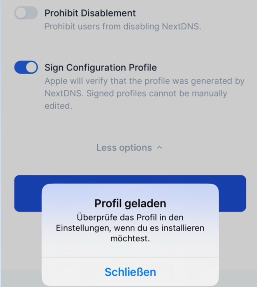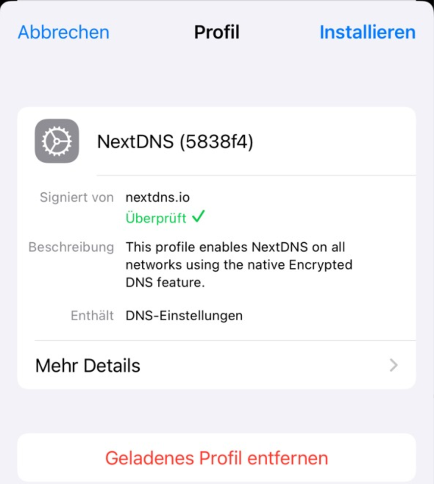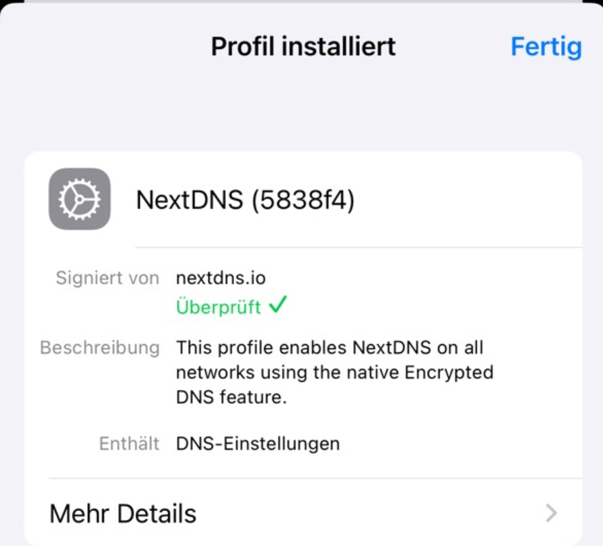 • Bei Erfolg sollten Sie die Meldung Profil installiert sehen