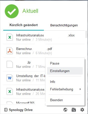 1. In Synology Drive die Einstellungen öffnen (Zahnrad-Symbol)