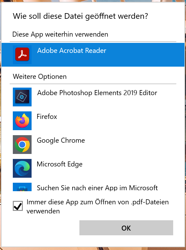 Hier setzen Sie den Haken "Immer diese App zum Öffnen von .*Dateityp*-Dateien verwenden"